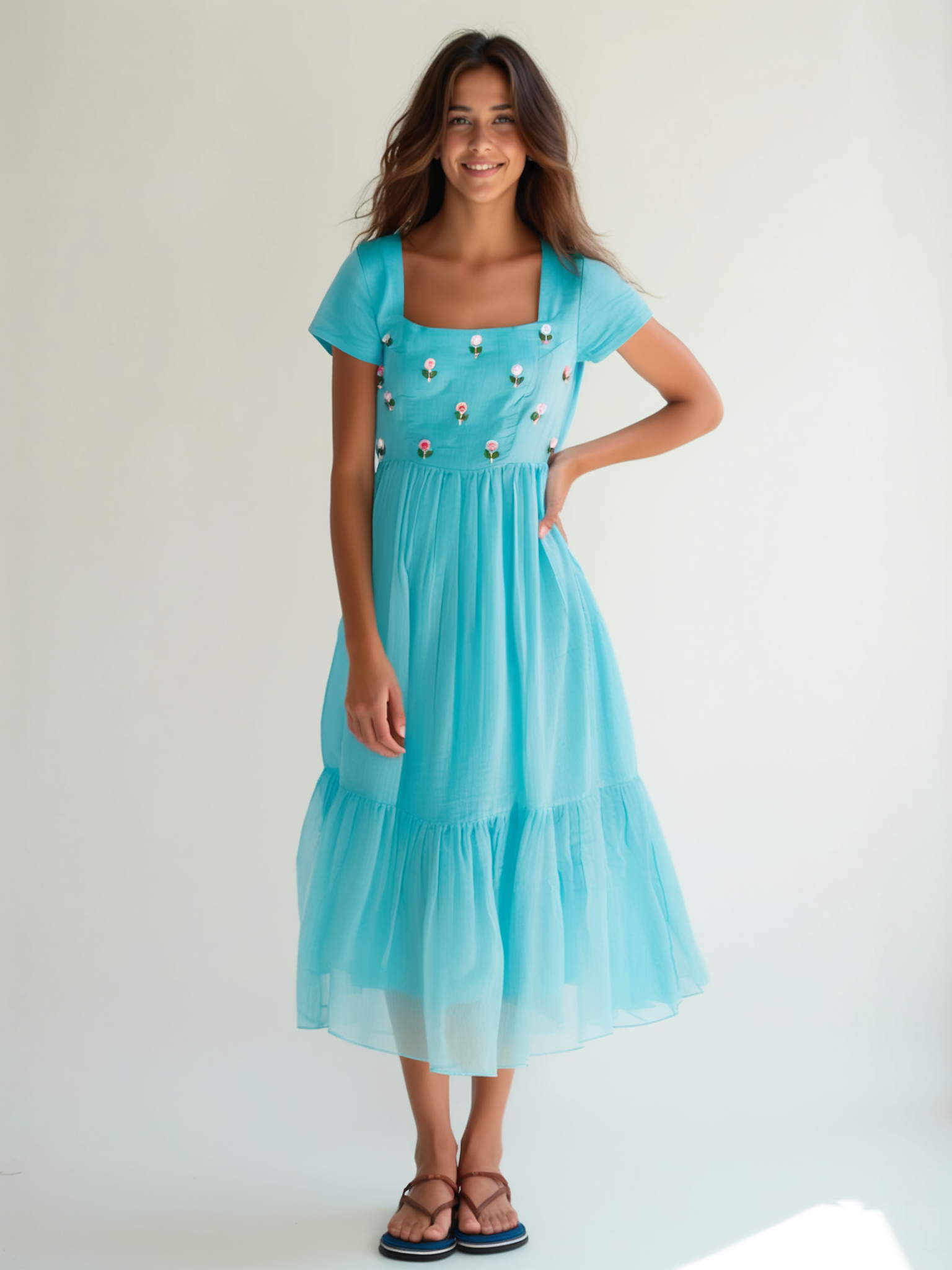This embroidered midi dress features delicate floral motifs across the bodice, adding timeless femininity to its design. The square neckline flatters effortlessly, while the tiered hemline creates a graceful, flowy silhouette. Designed in a lightweight, breathable fabric, this dress is perfect for daytime wear, vacation outfits, or festive gatherings. Its handcrafted embroidery and bohemian elegance make it a must-have for every wardrobe.