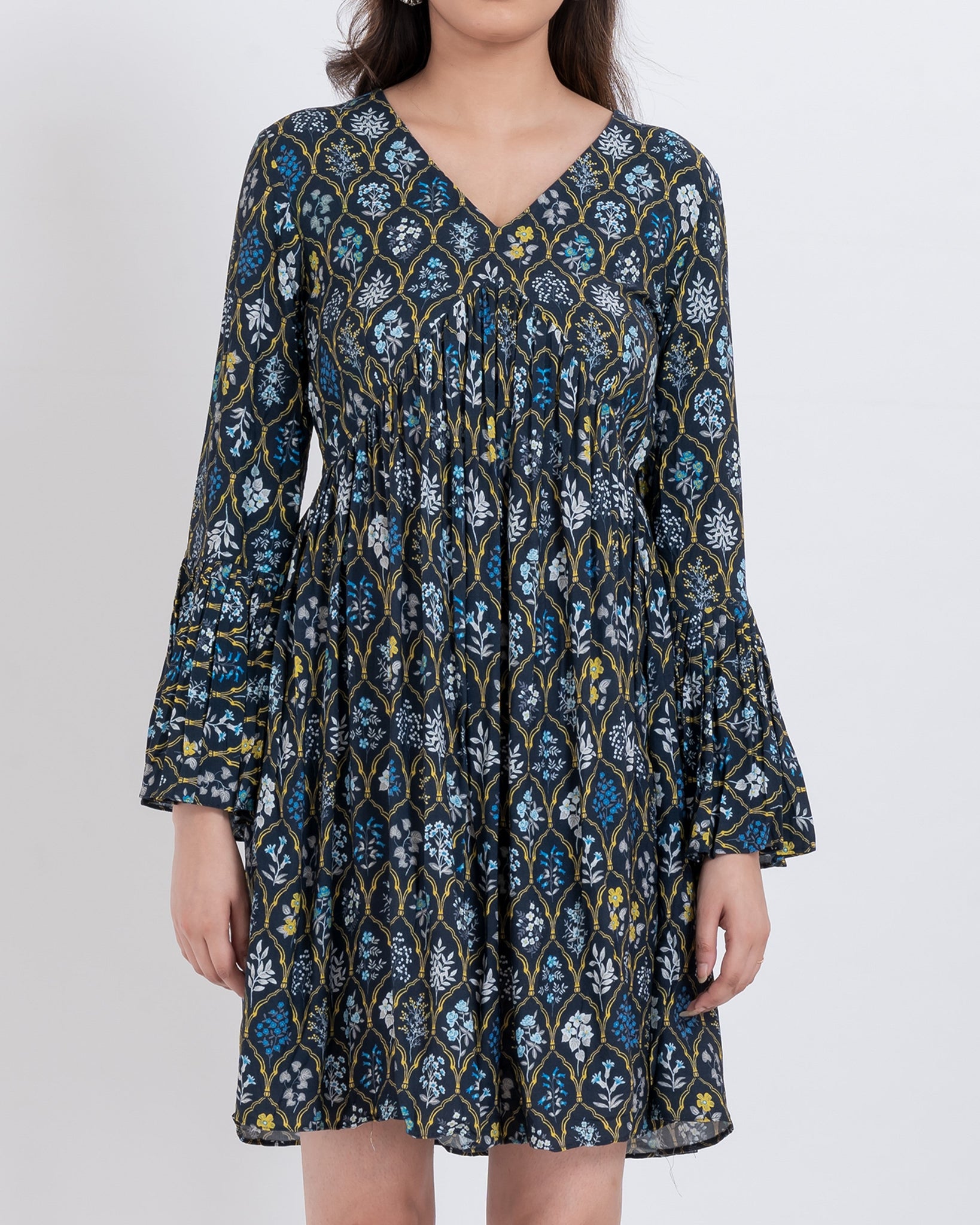 This mini dress features a botanical floral print with intricate leafy patterns in jewel tones. The V-neckline and bell sleeves add a romantic and bohemian touch, while the flowy A-line silhouette ensures comfort and elegance. Perfect for brunches, casual evenings, and weekend getaways, this dress is a versatile addition to your boho-inspired wardrobe.