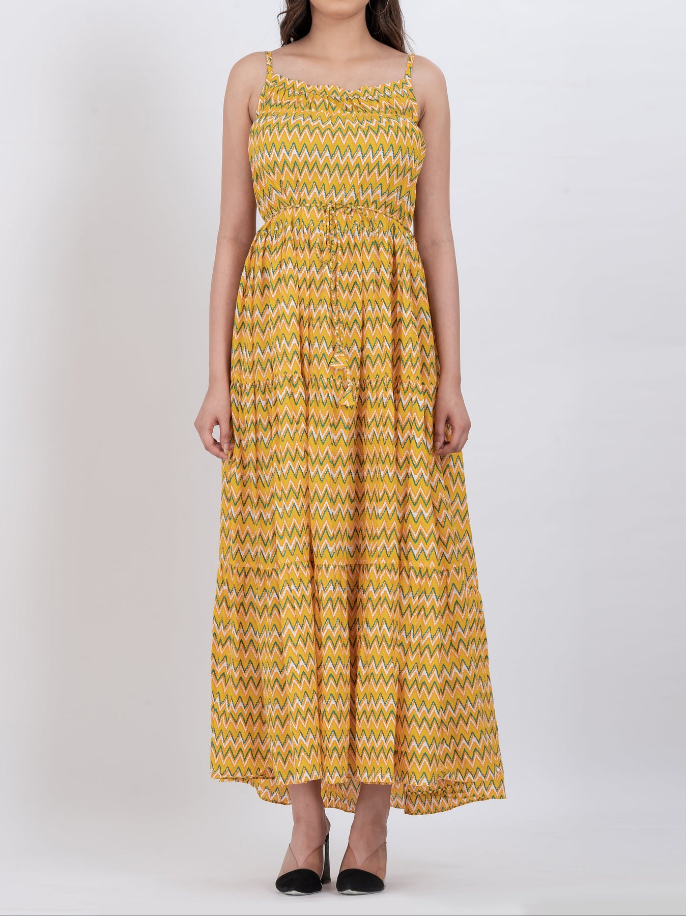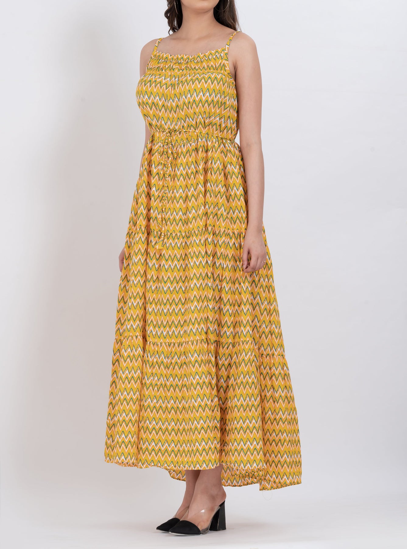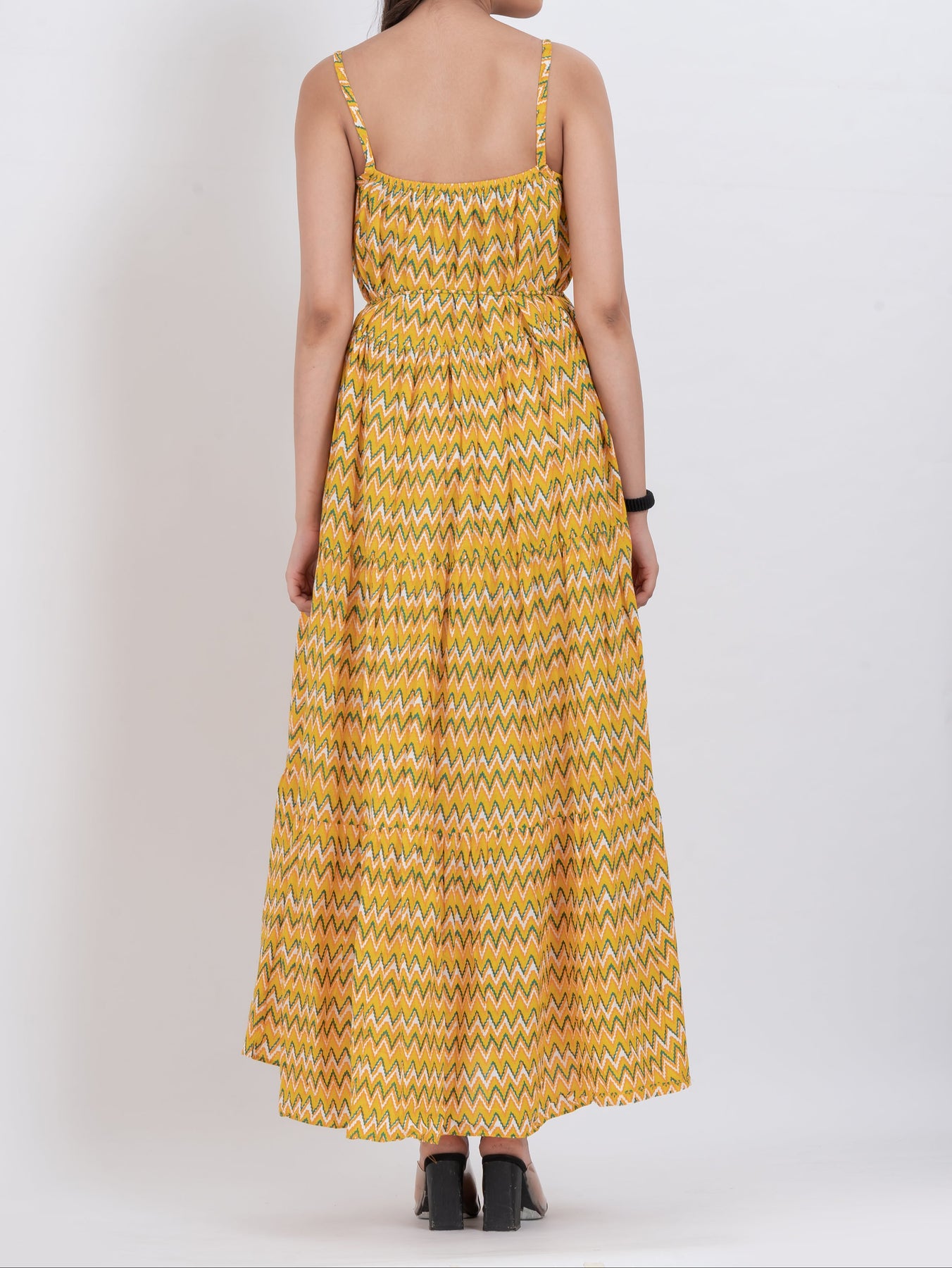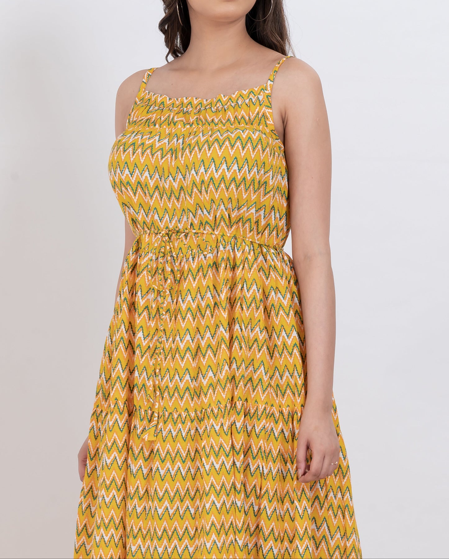 This stunning dress features a bold zigzag chevron print in vibrant green and orange hues. The zigzag pattern adds a playful and modern twist to a classic summer style. The bright and fresh color palette of the base with bold contrasting colors makes it an eye-catching choice for sunny days.
