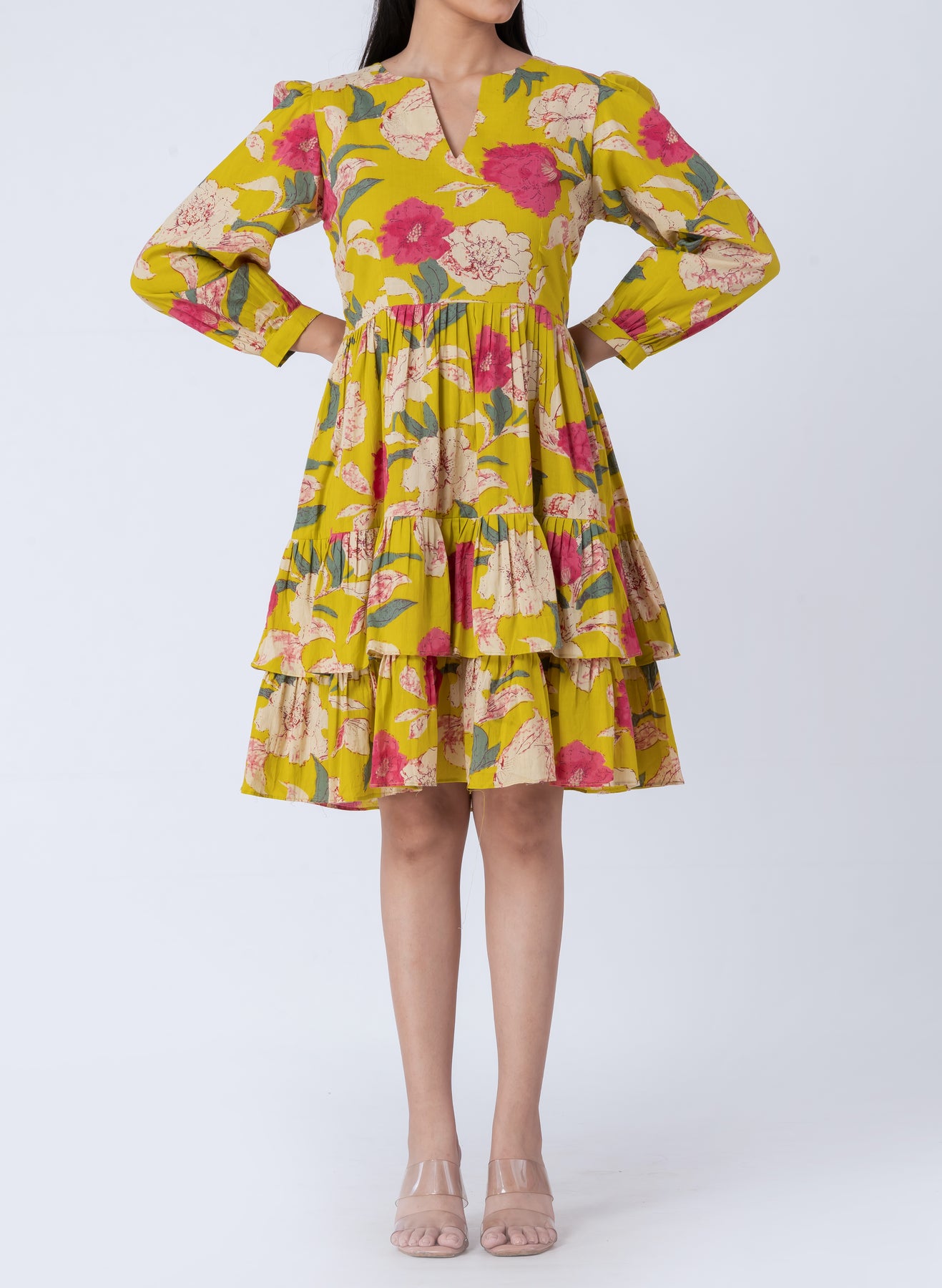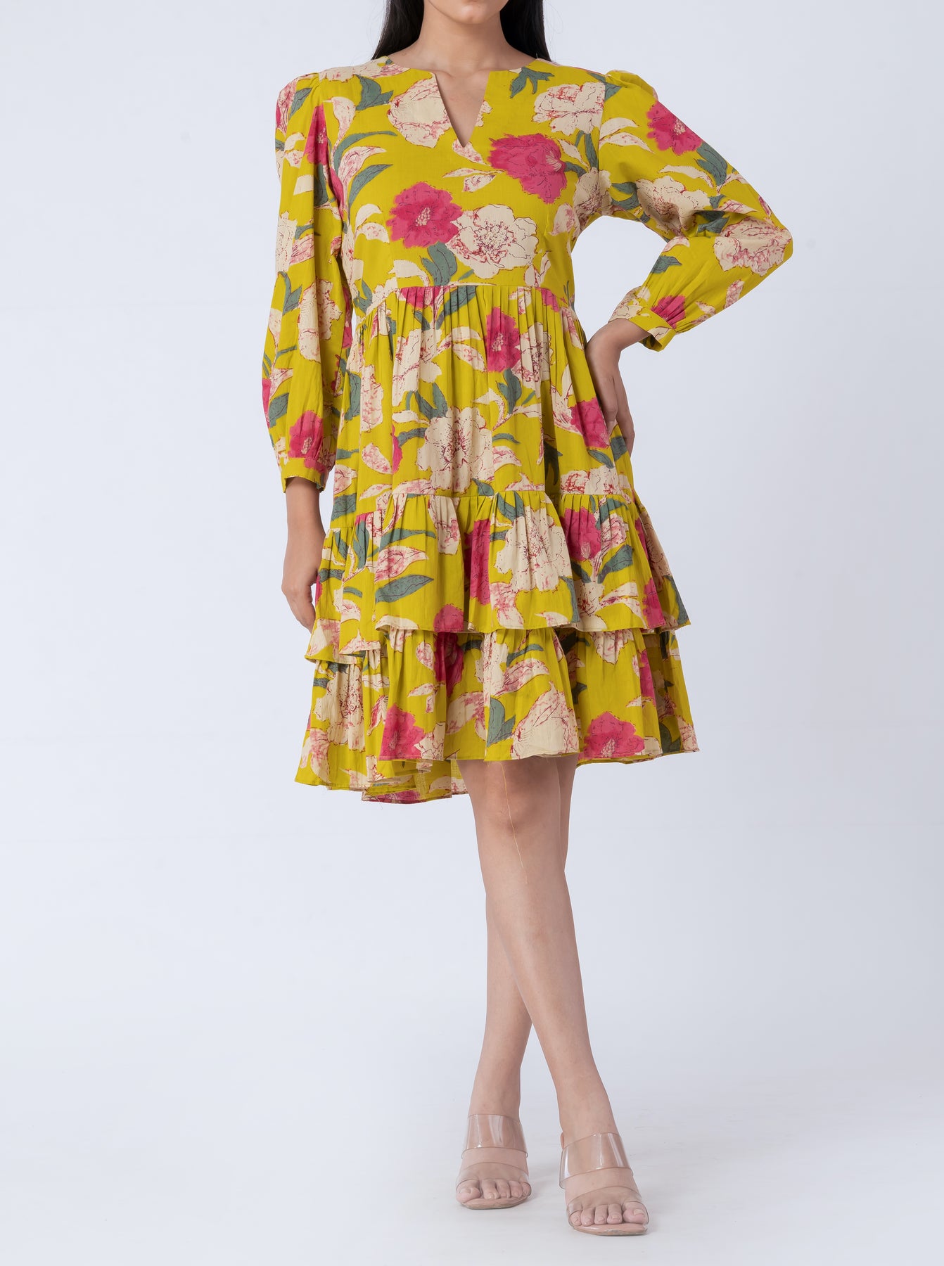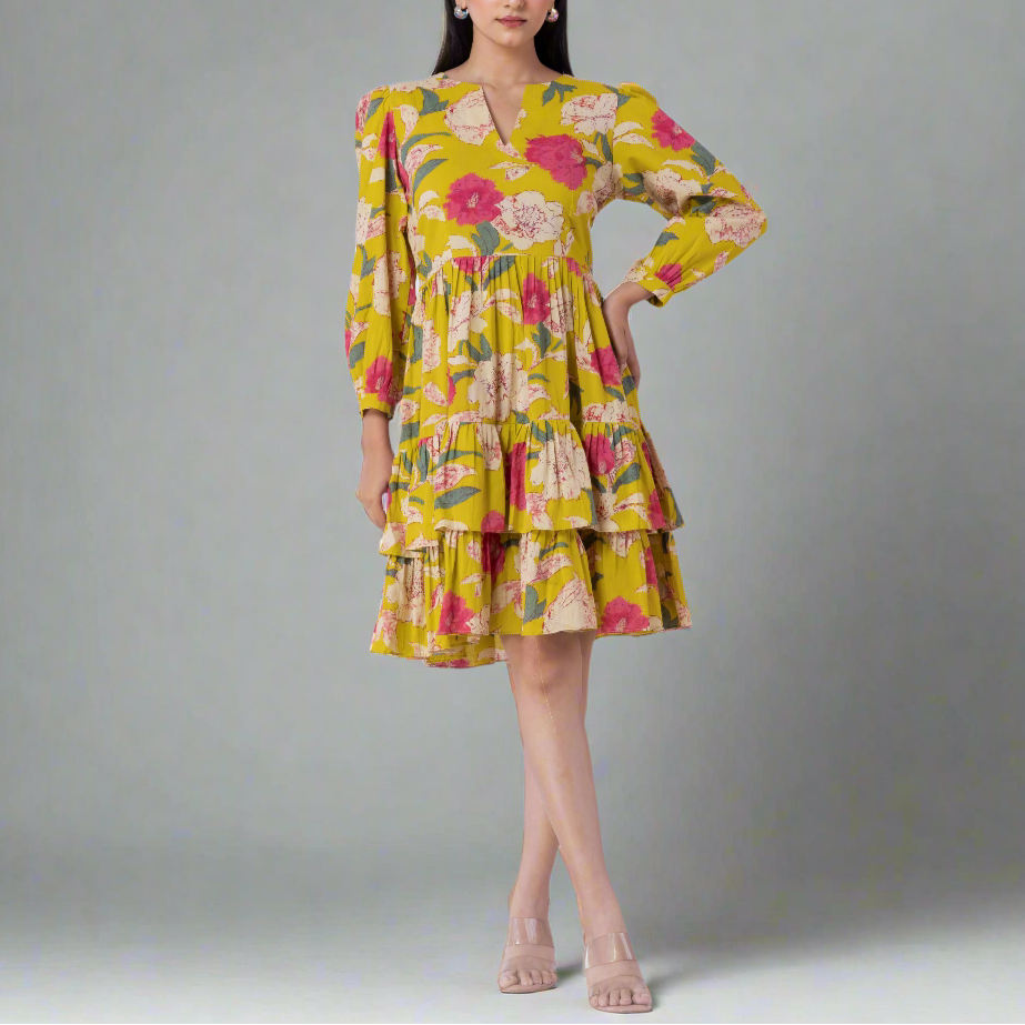 This tiered mini dress combines comfort with style. The V-neck and long sleeves make it an elegant choice for both casual and semi-formal events. The tiered skirt adds volume and movement, creating a flattering silhouette that moves beautifully with you.