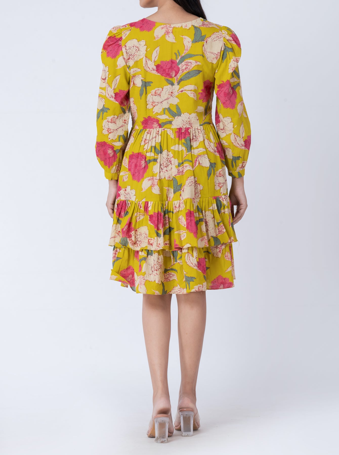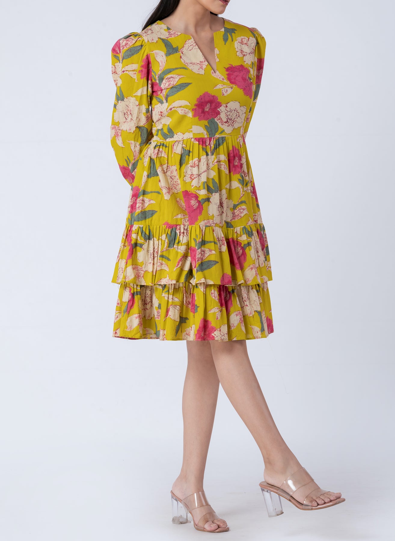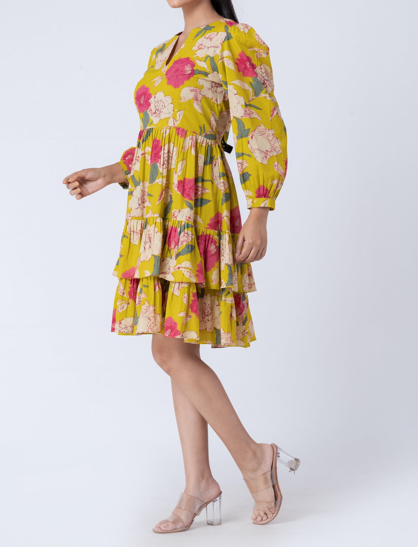 This tiered mini dress combines comfort with style. The V-neck and long sleeves make it an elegant choice for both casual and semi-formal events. The tiered skirt adds volume and movement, creating a flattering silhouette that moves beautifully with you.