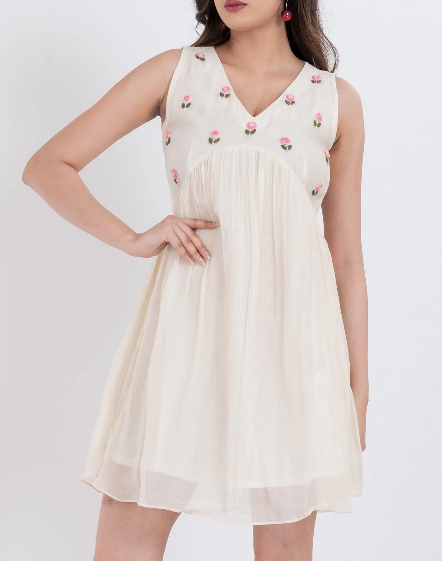 Hand-embroidered floral detailing around the neckline, adding an artistic and refined touch.