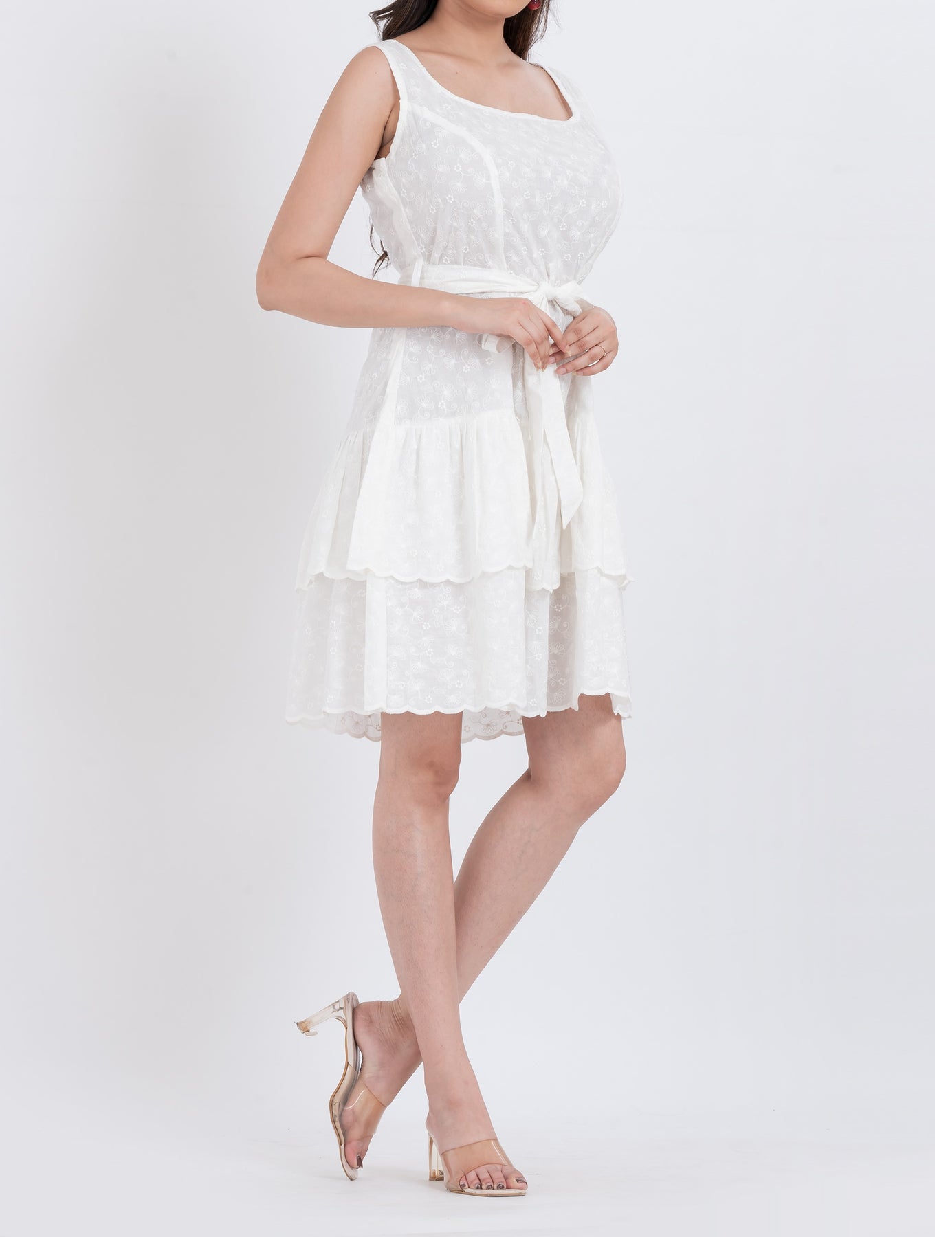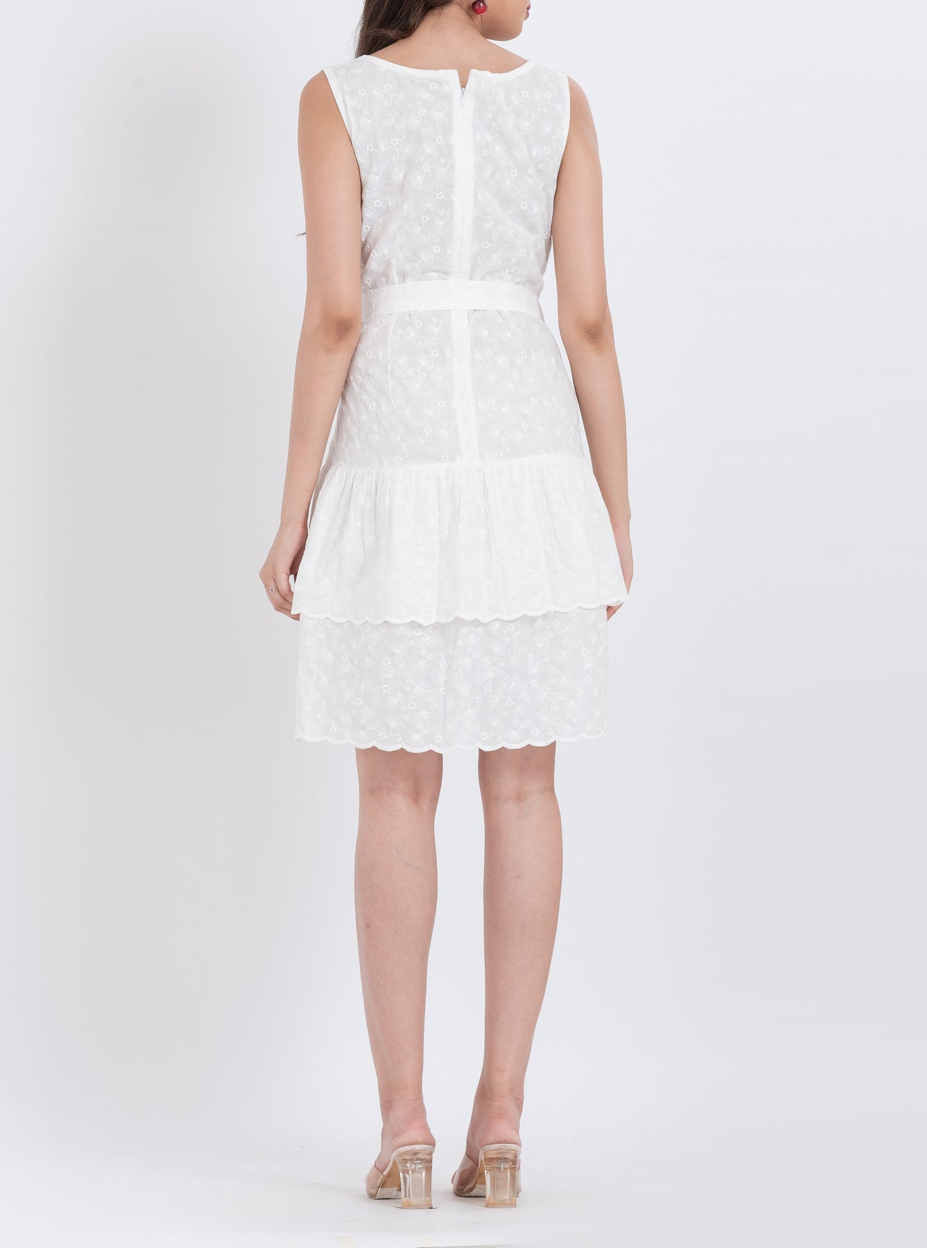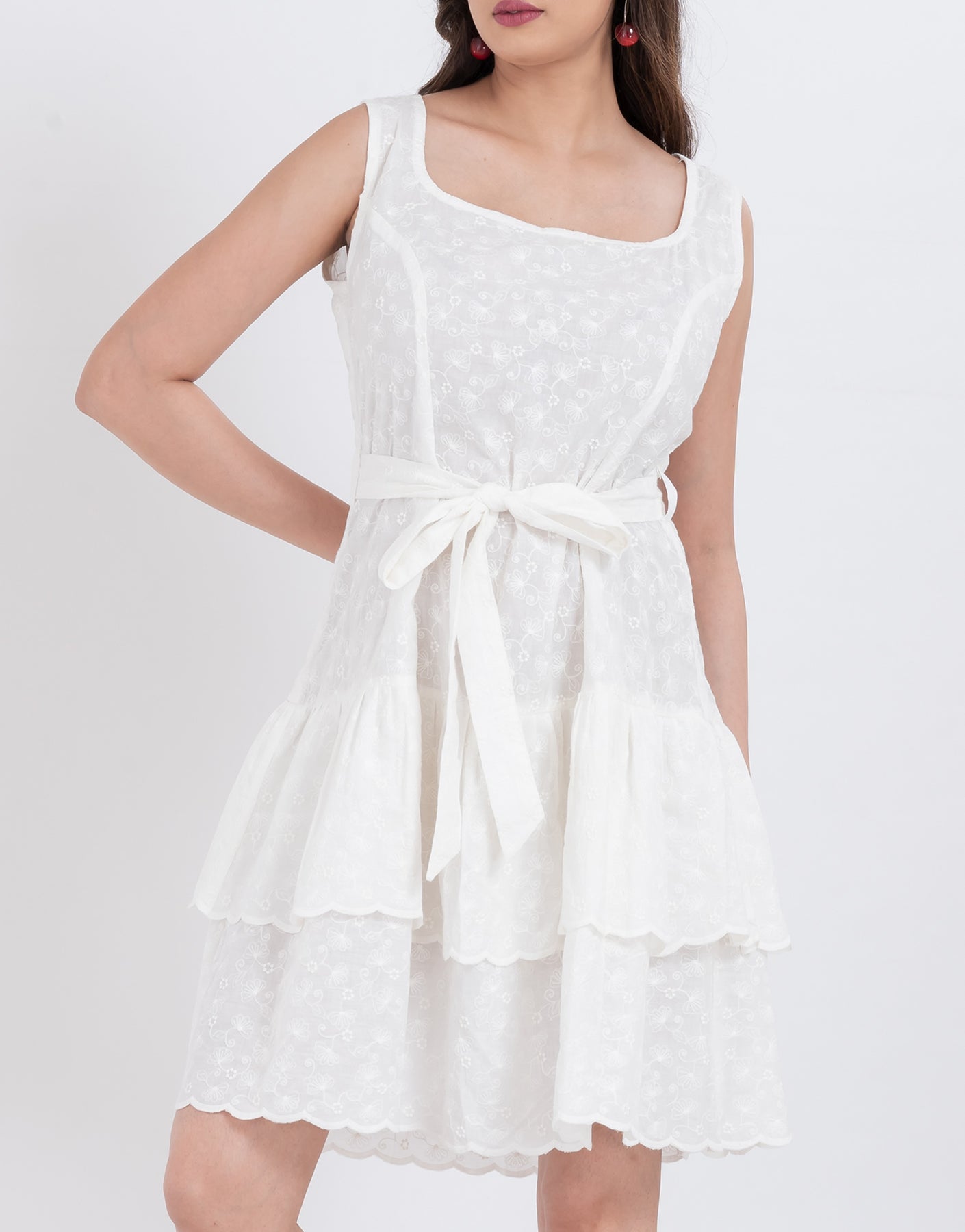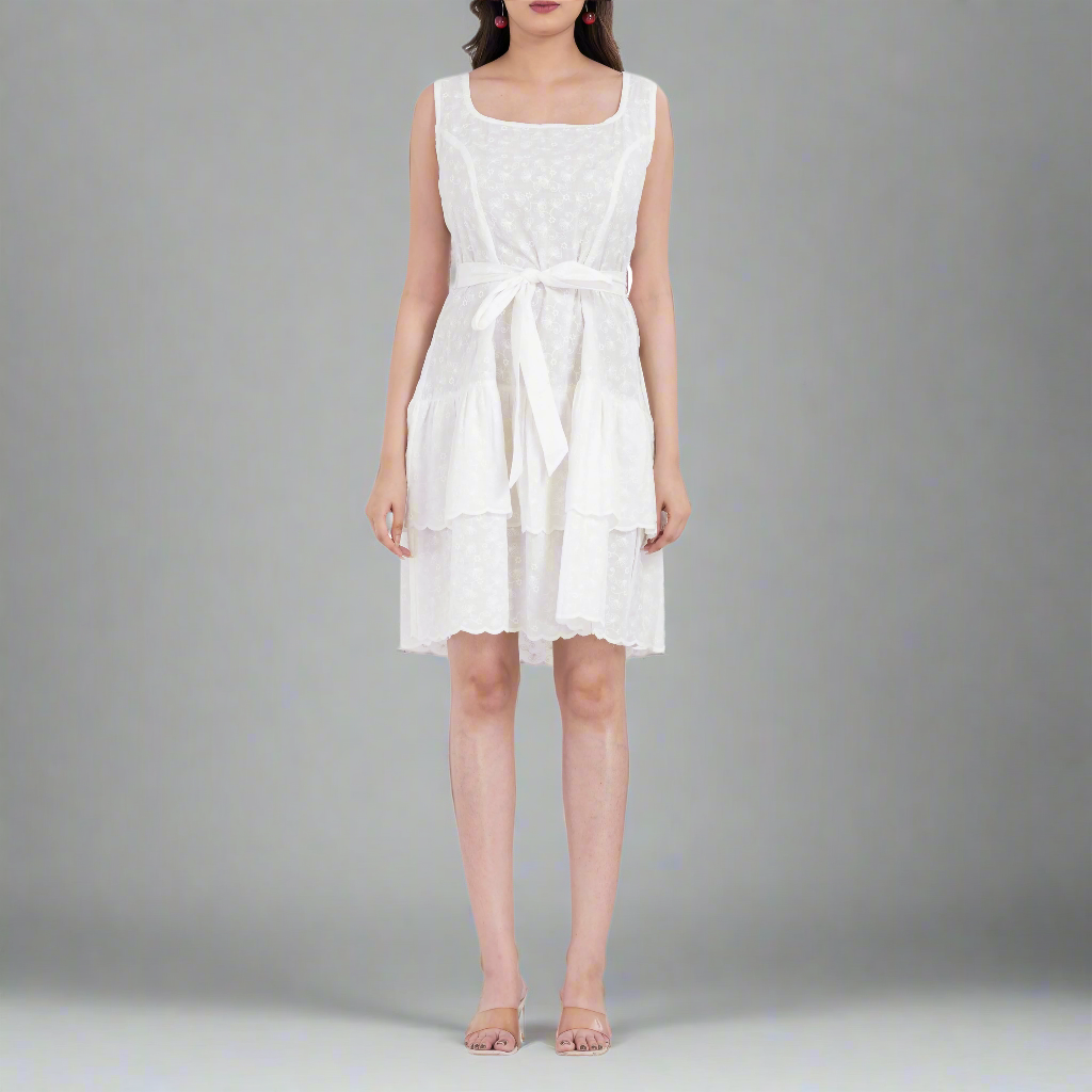 This beautiful tiered cotton dress features delicate floral embroidery, making it the perfect choice for a summer outing or casual day wear. The intricate floral print is both soft and timeless, adding a fresh, feminine touch to your wardrobe. Its relaxed A-line silhouette gives you comfort while exuding a chic, effortless style. This dress pairs perfectly with sandals or strappy heels for a complete look.
