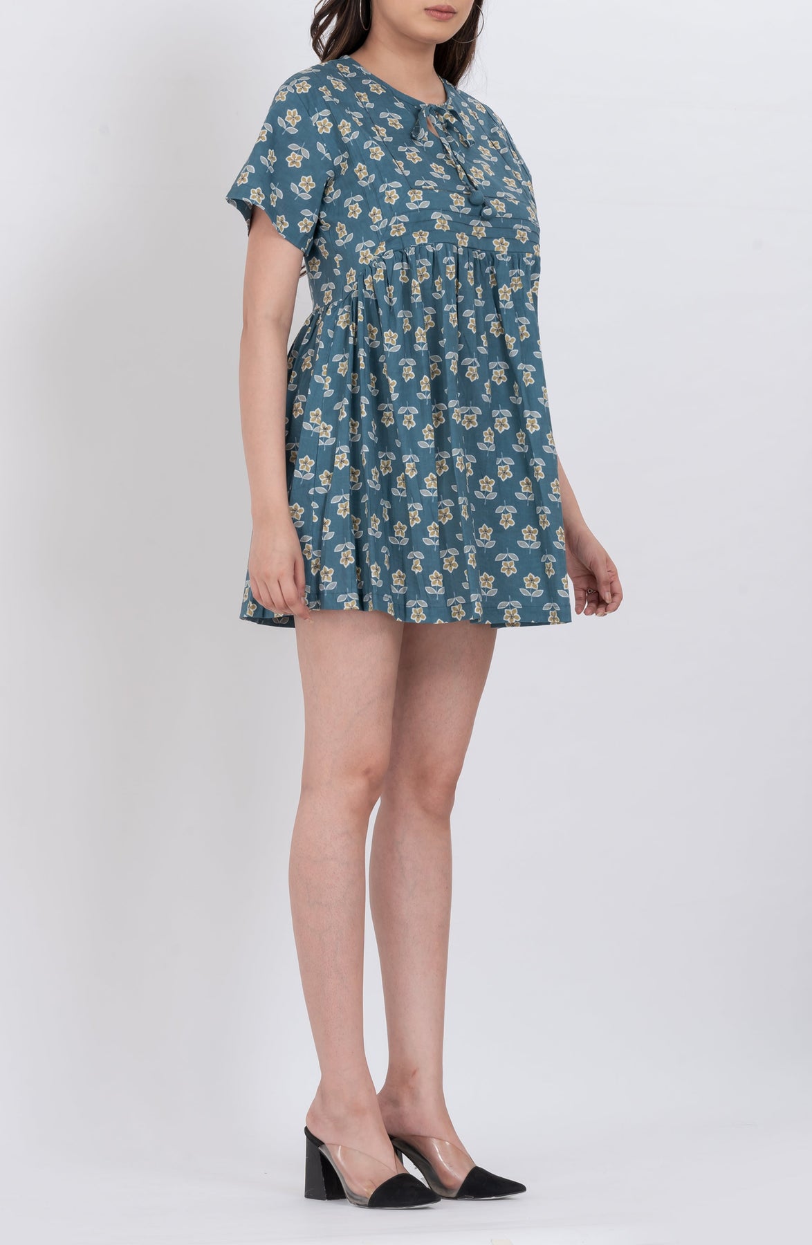 This charming floral babydoll dress is perfect for sunny days, featuring a relaxed fit with a flattering V-neck and tie-neck detail. The beautiful teal background paired with soft floral prints in warm hues gives this dress a fresh, feminine vibe. The loose, babydoll style provides comfort and ease, while the pleated skirt creates movement with every step, making it ideal for casual outings, brunches, or evening get-togethers.