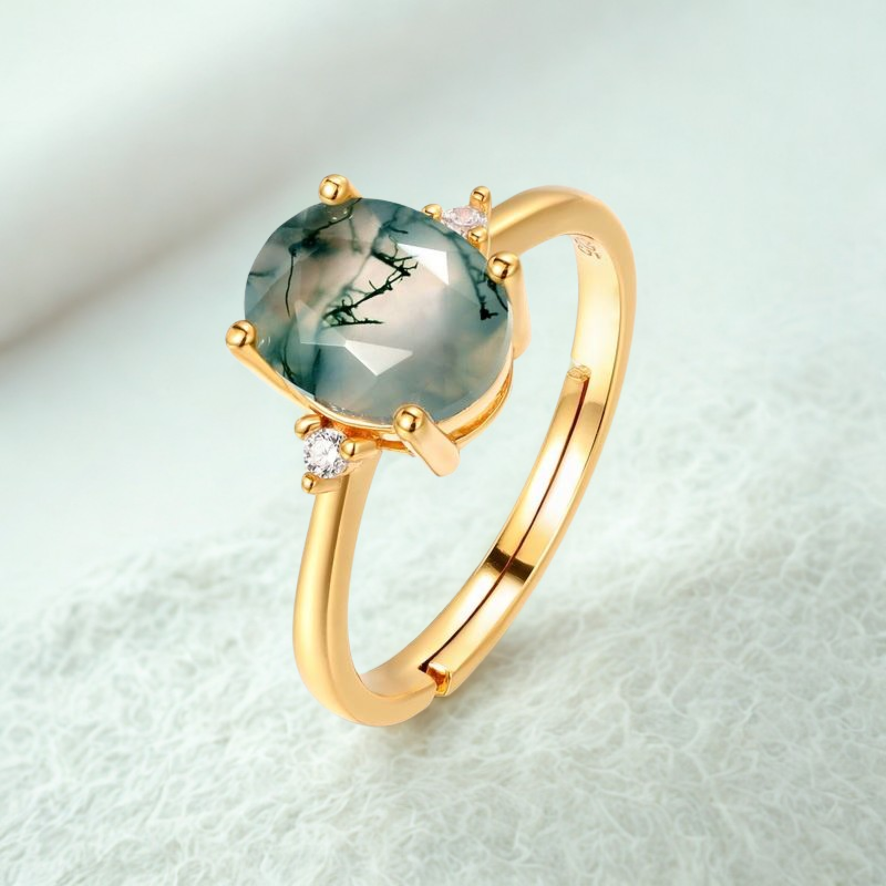 Unique Moss Agate Stones: Each ring features a unique moss agate stone, celebrated for its natural, earthy patterns and calming green hues.